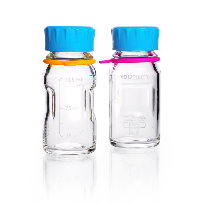 DURAN® YOUTILITY® GL 45 laboratoriumfles (helder), met schroefdop en schenkring (PP, cyaan), 125 ml