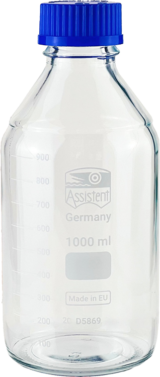 Een individuele laboratoriumfles wordt geleverd inclusief de GL kunststof schroefdop en de uitgietring.