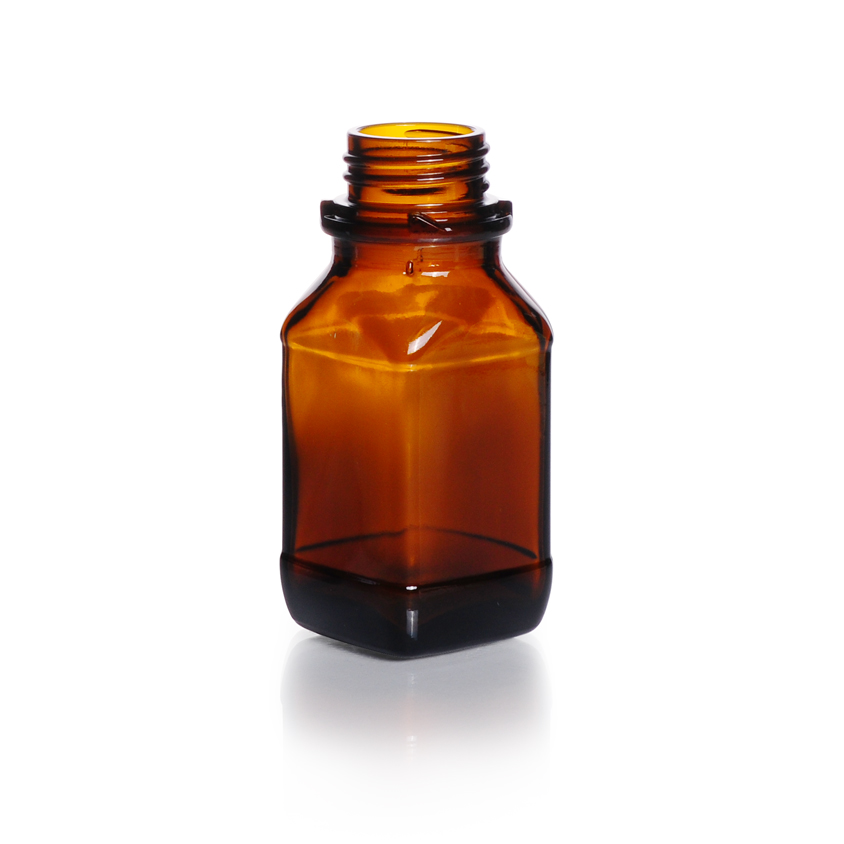 Vierkante fles met schroefdop, natronkalkglas, amber, brede opening, korte vorm, met DIN 32 S-schroefdraad, 100 ml