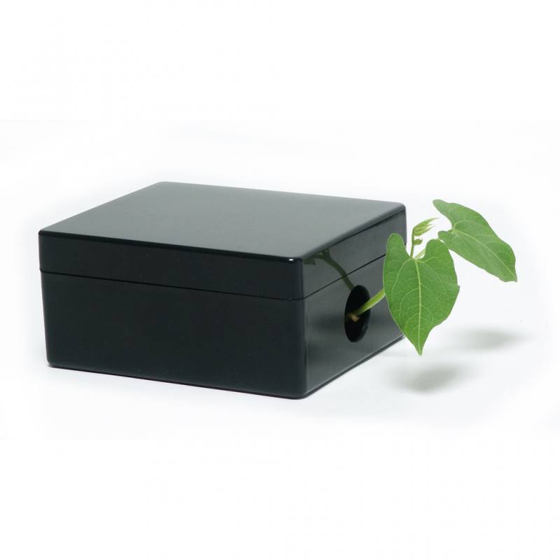 Bestaat uit: Een zwarte plastic doos met twee binnenwanden, een groot gat aan de zijkant, een deksel, een druppelaar en watten.