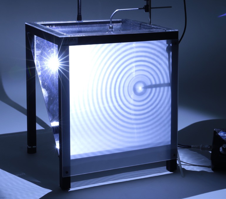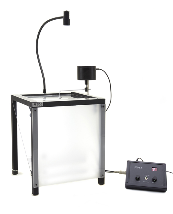De functiegenerator is uitgerust met een digitaal display en zorgt voor de synchronisatie van de trillingsbron en de lamp.