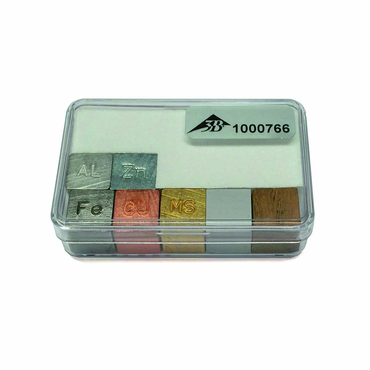 Set of seven cubes made of various materials for determining densities by weighing. Supplied in a storage case.
