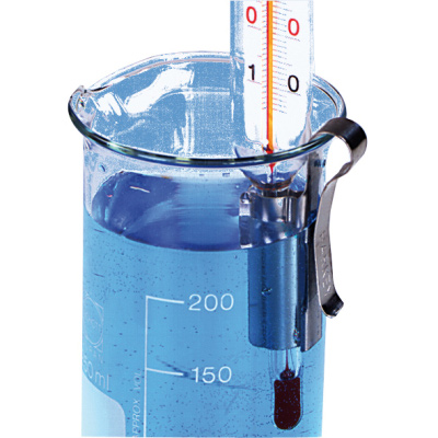 Thermometer clip Stainless steel clip for holding thermometers in beakers.